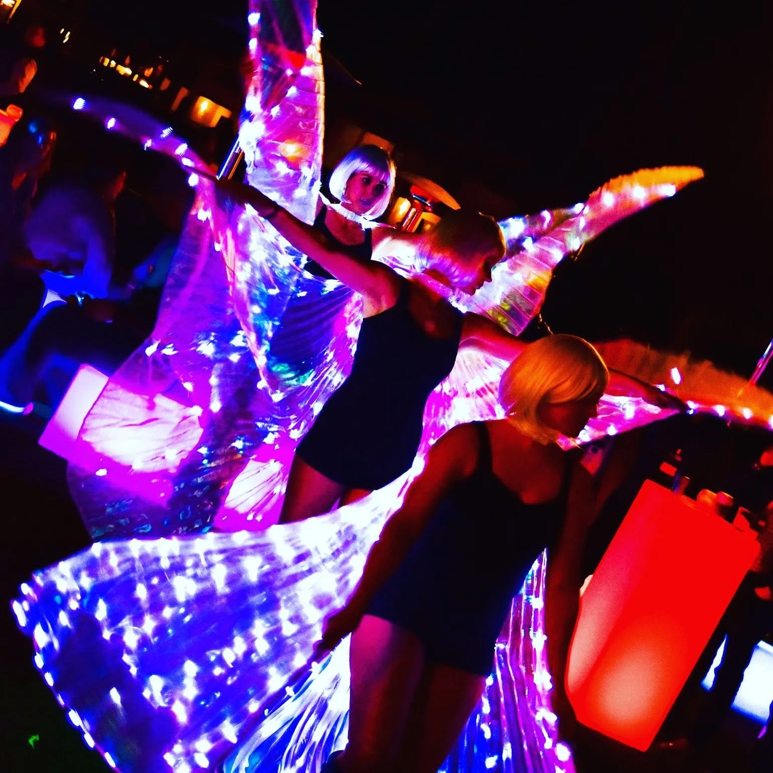These flowing fabric wings make our dancers look positively enchanting. Elevate your next event with ethereal larger-than-life butterfly characters on stilts! Or bring some glow to your evening event with LED wings. Perfect for greeting and walk-around ambient entertainment and can be adapted to enhance your specific theme.